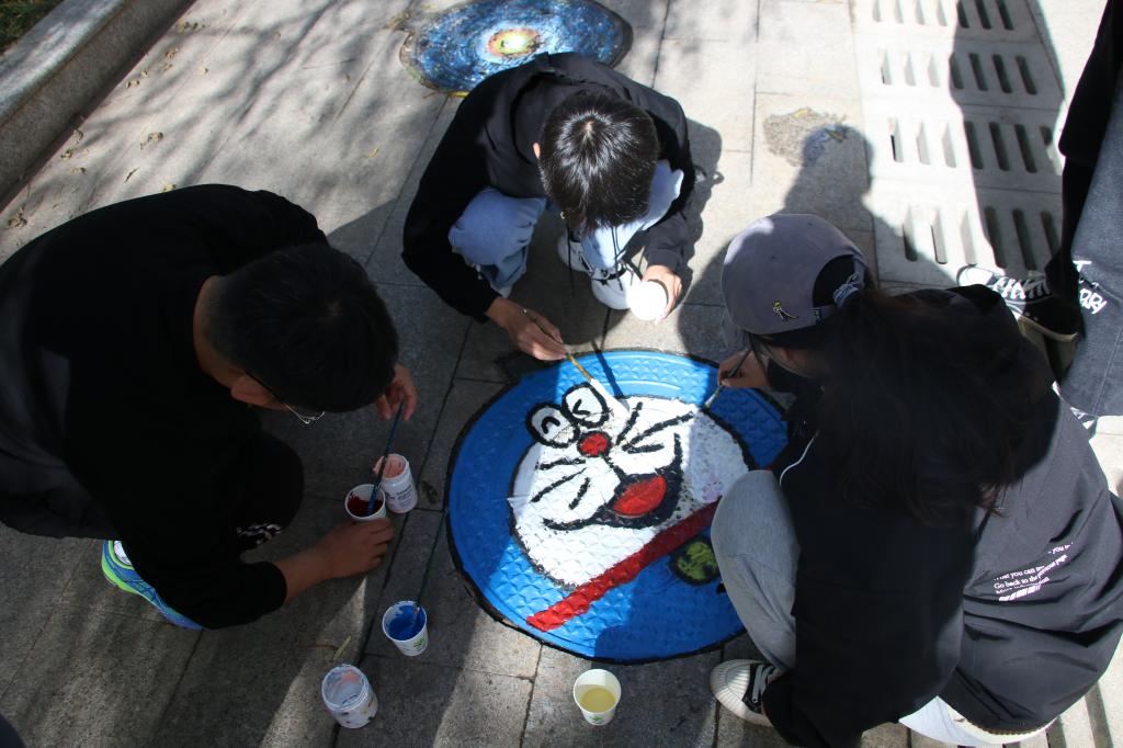 首先,同学们带水桶和扫把对所选井盖进行清理,确保颜料可以清晰上色。随后,开始调配颜料进行绘画,整个活动在学生们的欢声笑语中进行。最后,经过学生们2个多小时的执笔绘画,全部作品都被完美的呈现在了小小的井盖上。原本“灰头土脸”的井盖在学生的妙笔下变得充满生机与活力。有学生说:“愿我的一笔之力能够温暖寒冬里的行人。”