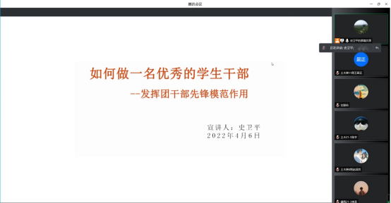 为引导青年学生进一步坚定理想信念,全面提升学生骨干的综合素质,4月6日晚,万象城awc888通过线上会议形式举办“青马工程”培训班第五讲。本次讲座由学生工作办公室辅导员史卫平担任主讲,“青马工程”培训班全体学员和学生会主要干部参加讲座。