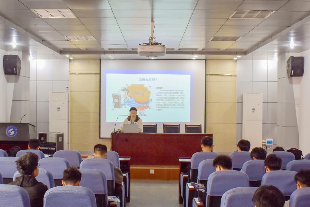 安管会主席岳红海从“你被骗过吗?”这一问题引出我校的一起诈骗案例,说明什么是电信诈骗,紧接着从“QQ诈骗、冒充身份诈骗、网络购物诈骗、虚假中奖诈骗”等常见的诈骗方式说起,详细介绍了常见的诈骗套路,最后介绍了预防电信诈骗的“三不一要、六个一律、八个凡是”,提醒同学们利用好方法,警惕电信诈骗。
