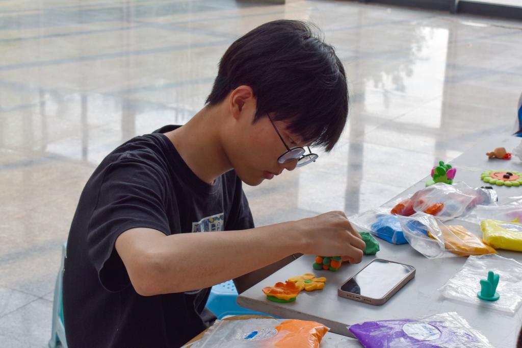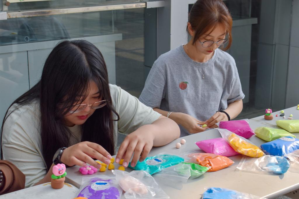 本次活动以感恩母亲节为主题。学生们巧妙构思,拿到黏土后迫不及待地开始制作,通过一步步揉、捏、搓、贴等动作把对母亲浓浓的爱融入黏土中。经过两个小时地制作,学生们完成了二十余个黏土作品,有绿叶簇拥的康乃馨、有五颜六色的气球。莘莘学子们以“巧手慧心”表达对母亲的爱。